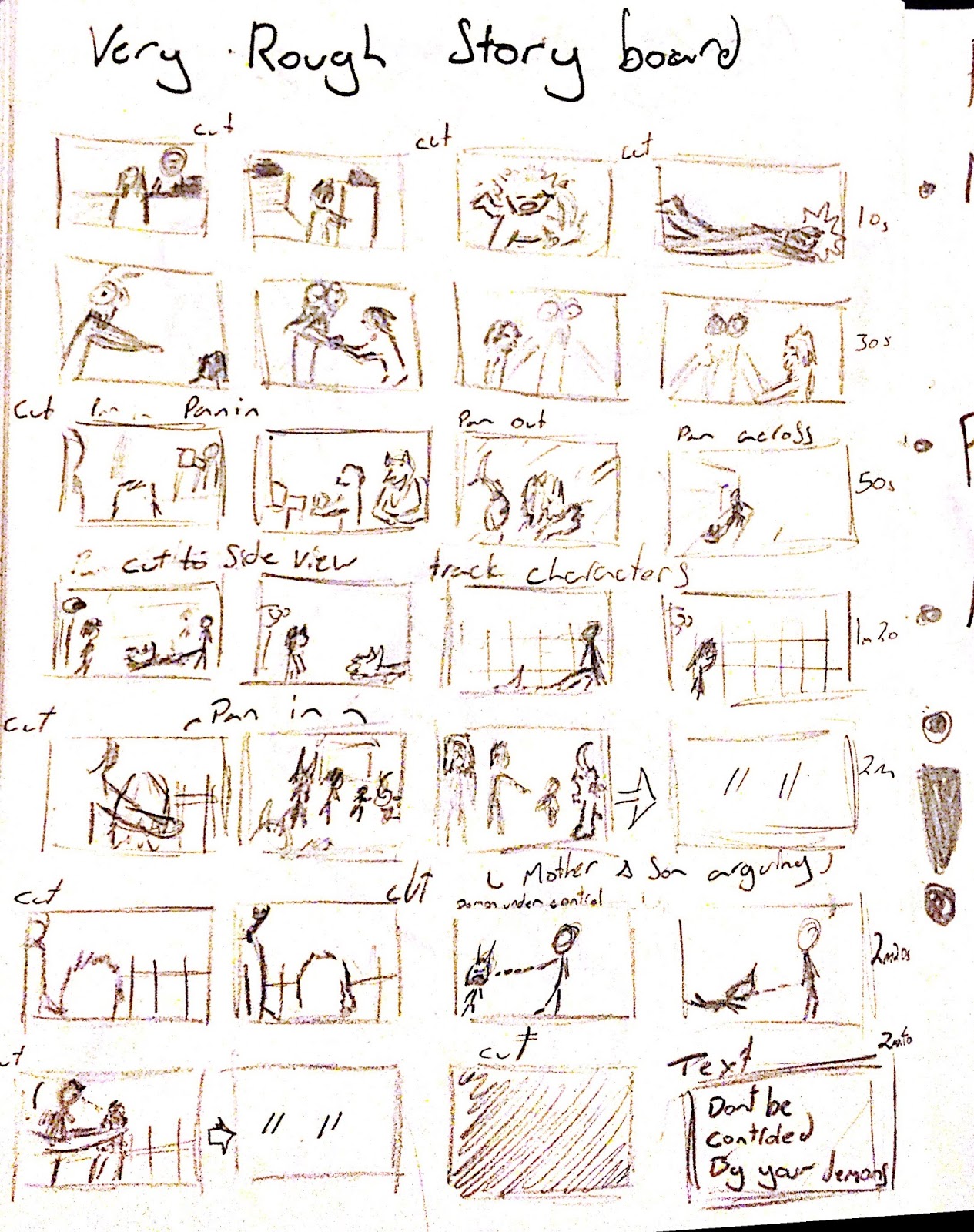 This is a very rough story board to help me visualise my idea before creating the actual story board and animatic.